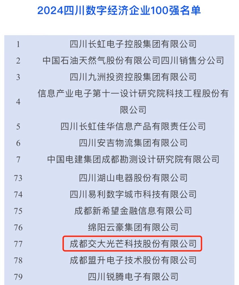 9ÔÂ26ÈÕ£¬ËÄ´¨´óÆóÒµ´ó¼¯ÍÅÉú³¤´ó»áÔڳɶ¼ÕÙ¿ª£¬»áÉÏ£¬ËÄ´¨Ê¡Æóҵ͎á»áÐû²¼ÁË2024ÄêËÄ´¨ÆóÒµ100Ç¿¡¢ÖÆÔìÒµ100Ç¿¡¢·þÎñÒµ100Ç¿ºÍÊý×Ö¾¼Ã100Ç¿°ñµ¥£¬½»´ó¹âÏßÈÙµÇËÄ´¨Êý×Ö¾¼ÃÆóÒµ100Ç¿°ñµ¥£¬Î»ÁеÚ77λ¡£